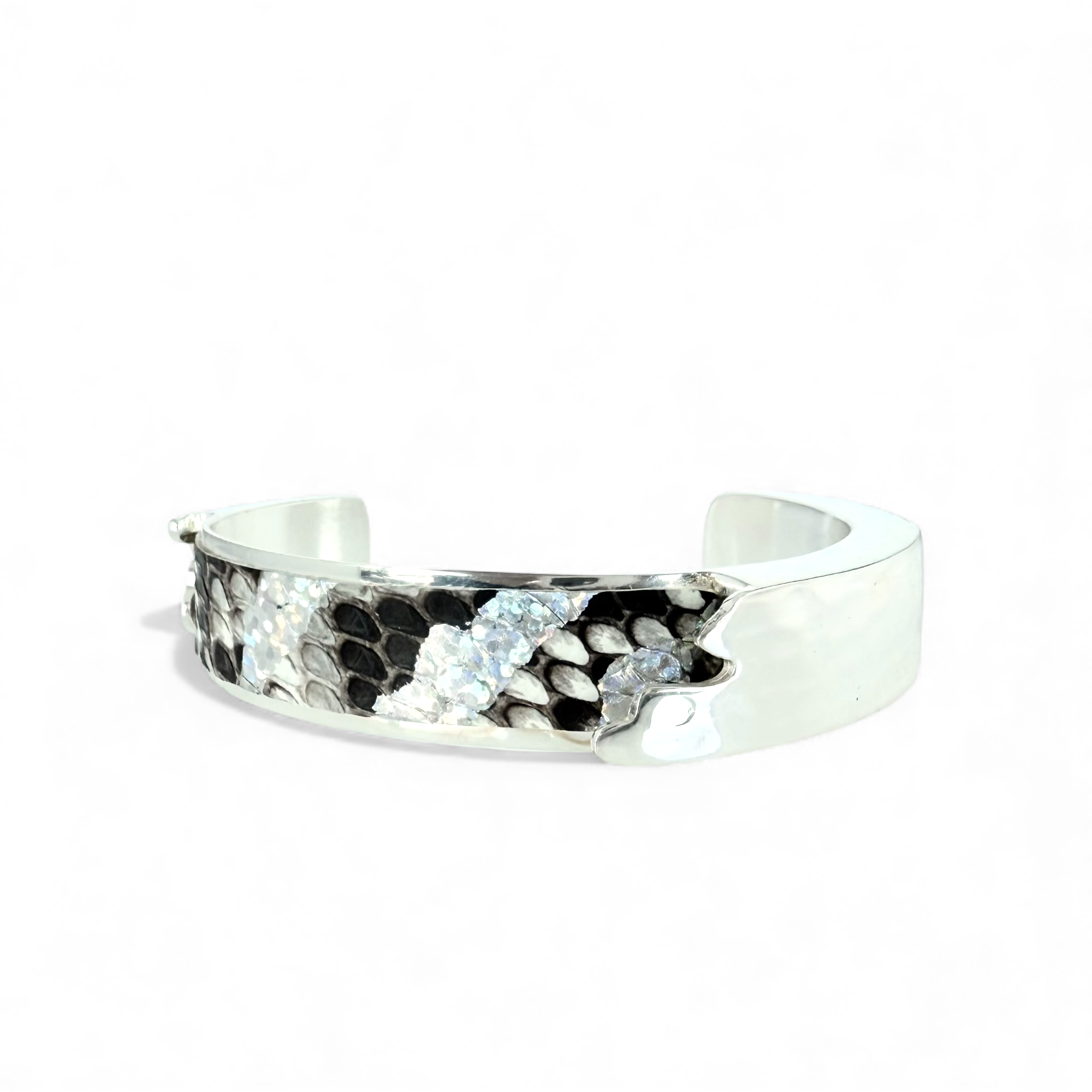 • Genuine python with a holographic gold shimmer on a brown and white background