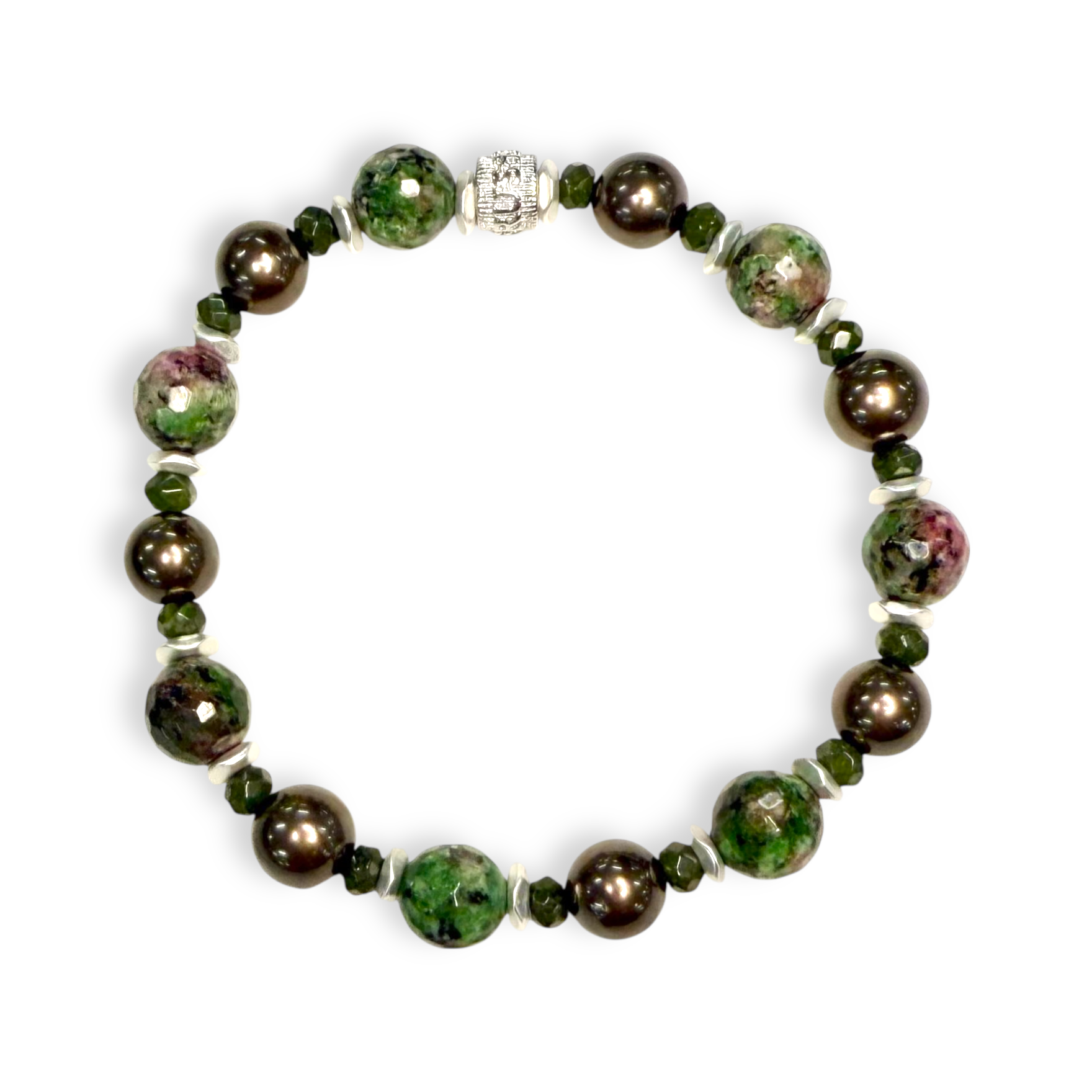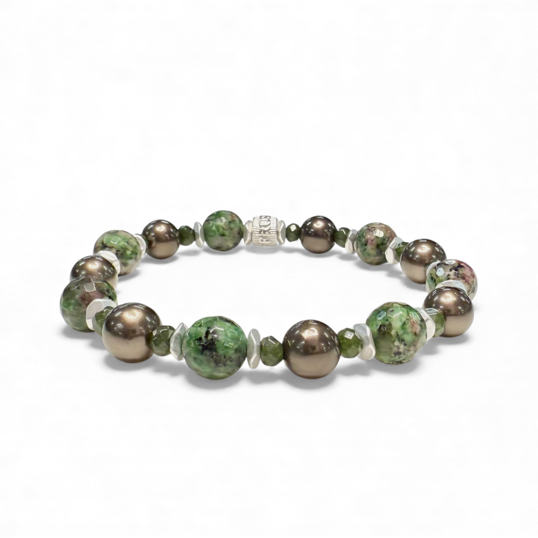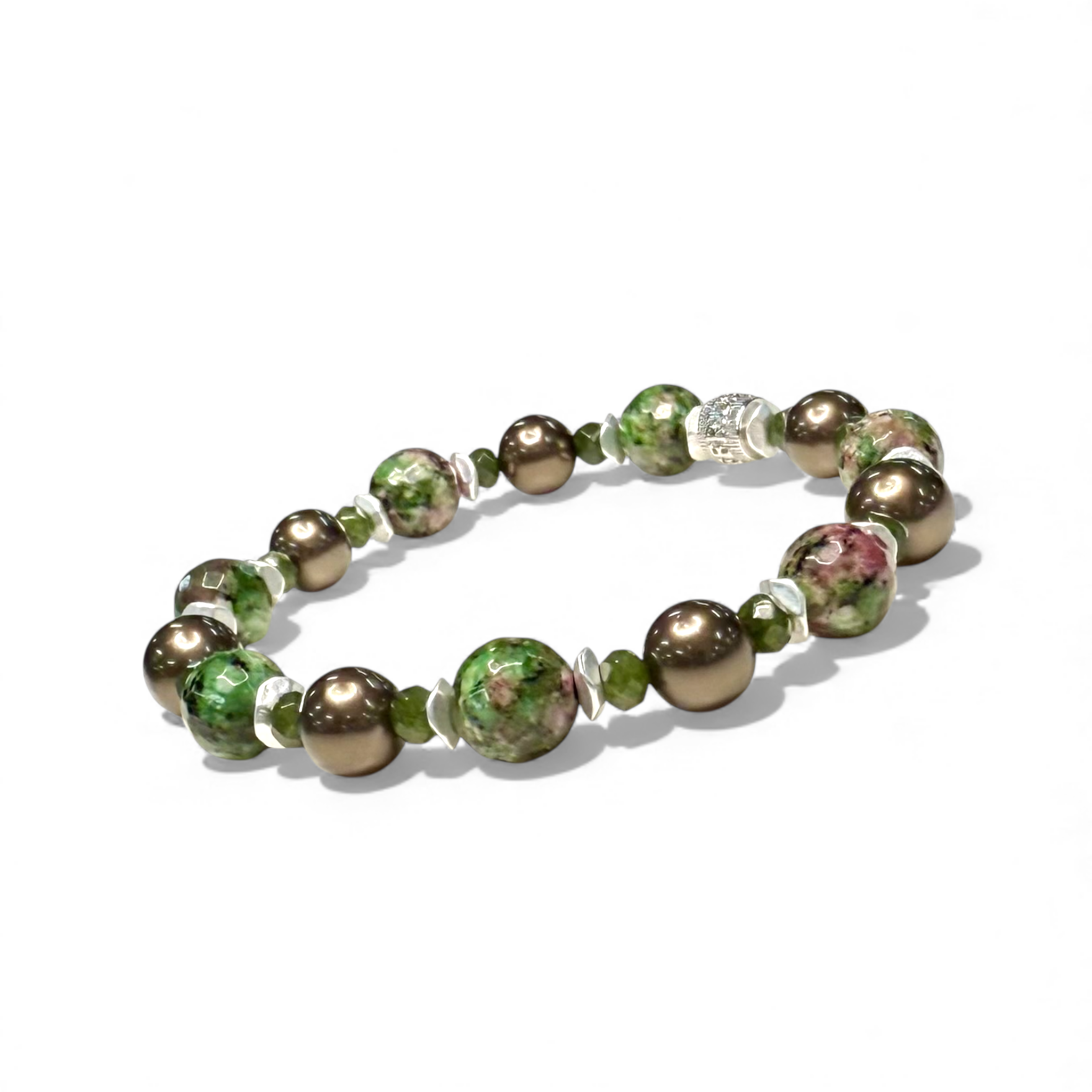• Marbled faceted stone bead with a mixture of purple and emerald